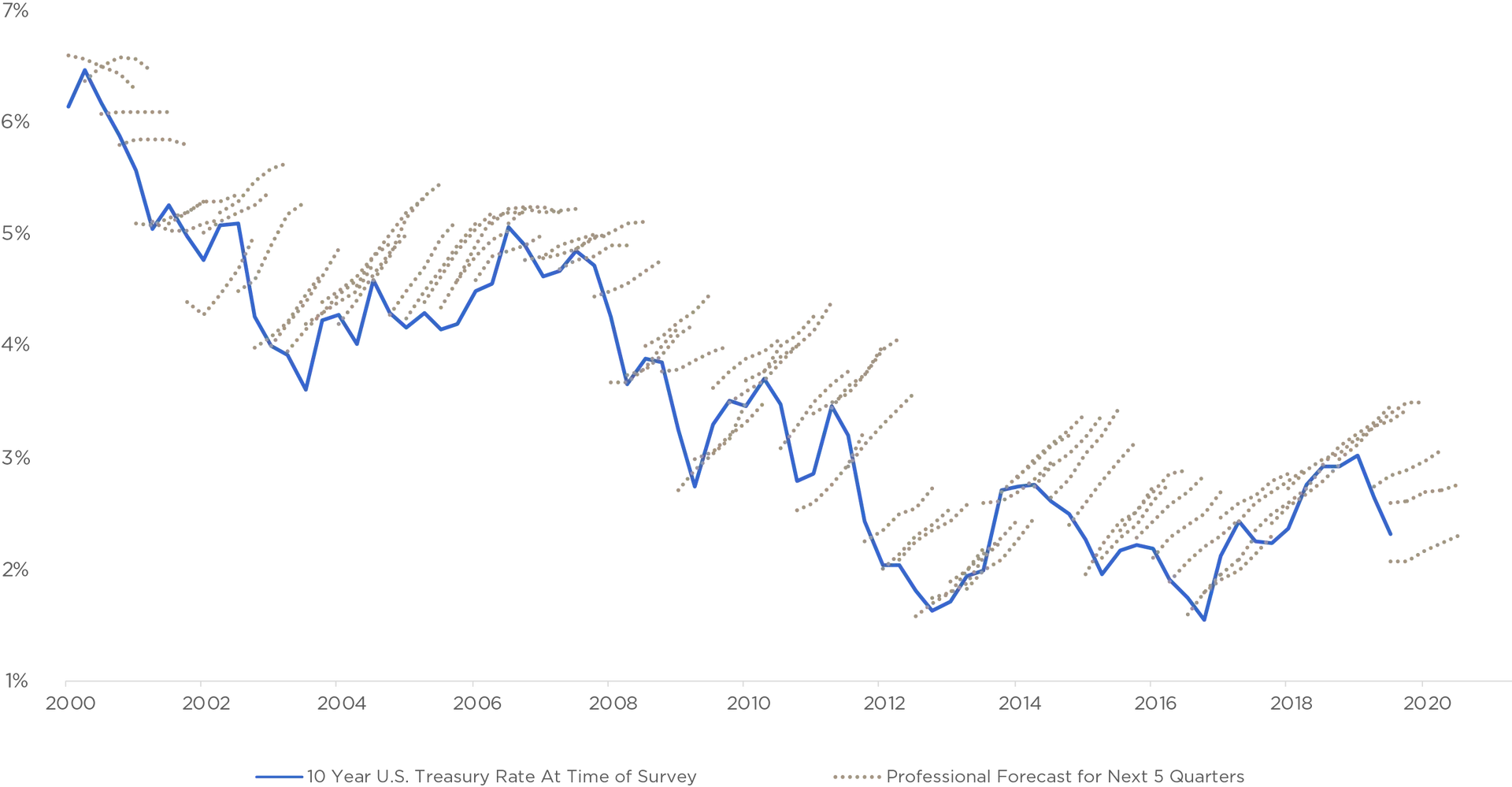Source: Professional Forecasters’ Projections. Source: Figure 3 from Kirby, Barry, “Diminishing Returns: The Incredible Shrinking Bond Yield,” CapTrust, October 24, 2019.