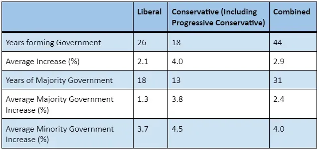 - Conservative (including Progressive Conservative) governments have seen higher home price appreciation on average than Liberal governments.