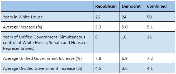With regards to unified vs. divided government, it is tempting to hypothesize that unified governments cause higher rates of appreciation. However, this can’t be determined without further study, and in our opinion, this relationship is much more likely to be coincidence, as shown by the very different Canadian experience with Majority/Minority governments.
