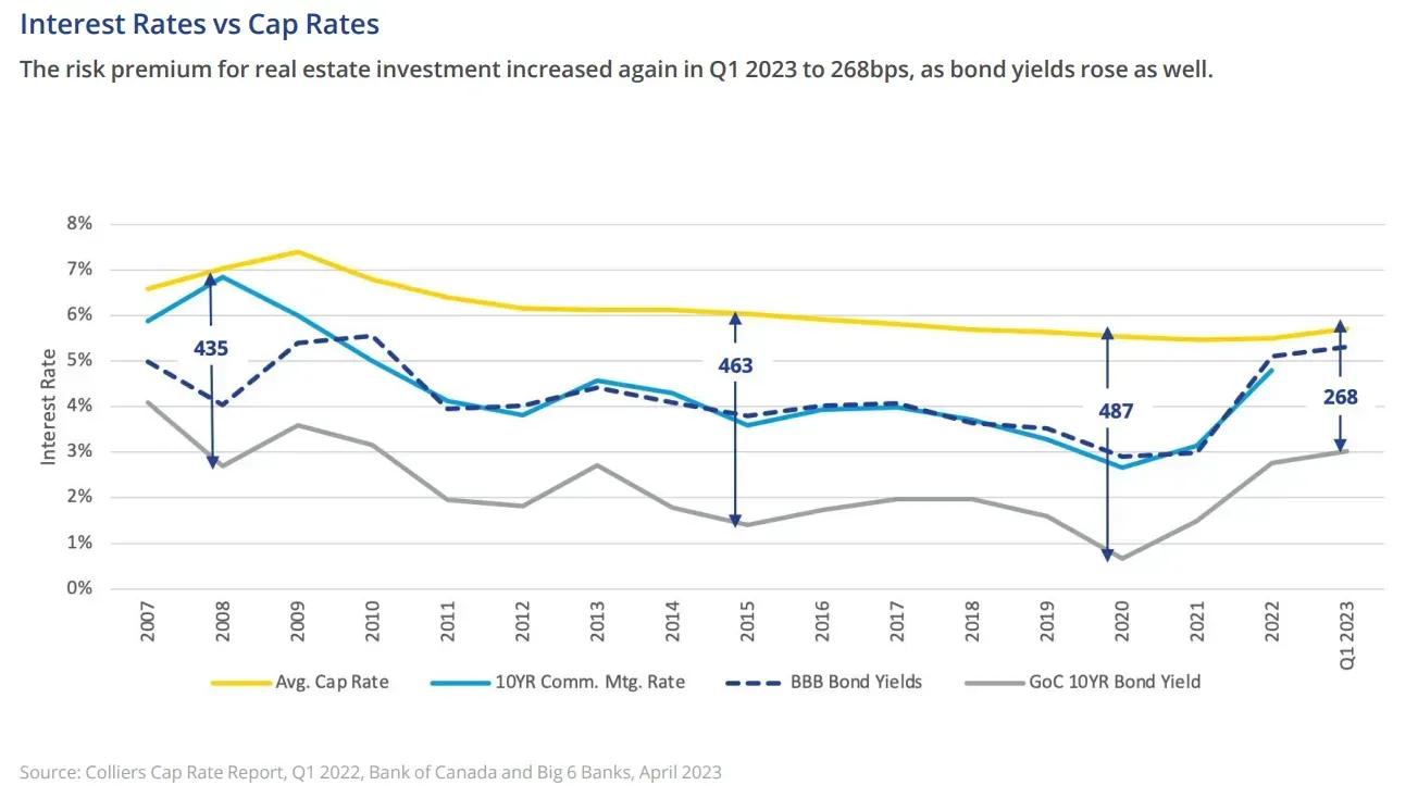 If history is a guide and interest rates stay higher for longer as has been forecasted by the Bank of Canada, we anticipate that asset prices will fall and cap rates will likely rise over time and settle in closer to historical averages.