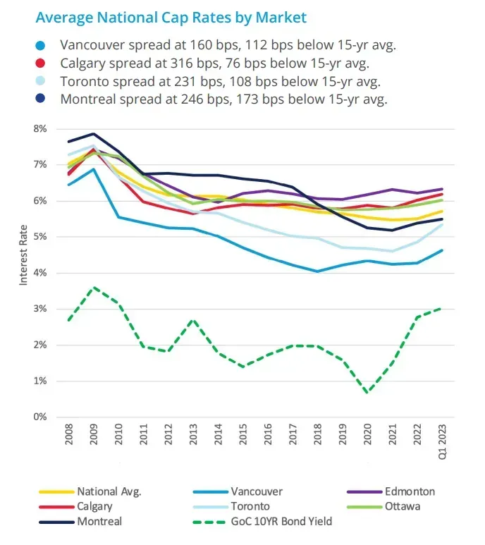 On average, cap rates in Vancouver tend to be lower than cap rates in Alberta. In all markets, the cap rate spreads are considerably below historical averages.