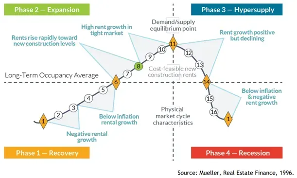Dr. Glenn Mueller, a professor at the University of Denver, developed a simple model for the real estate cycle that provides a useful starting point for analysis. His real estate cycle model is separated into 4 phases and 16 points, as follows: