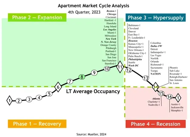 While the below chart from Dr. Mueller shouldn’t be used in isolation to determine the positioning of any individual submarkets, it does give a strong sense of where most U.S. urban centres are at in the real estate cycle: