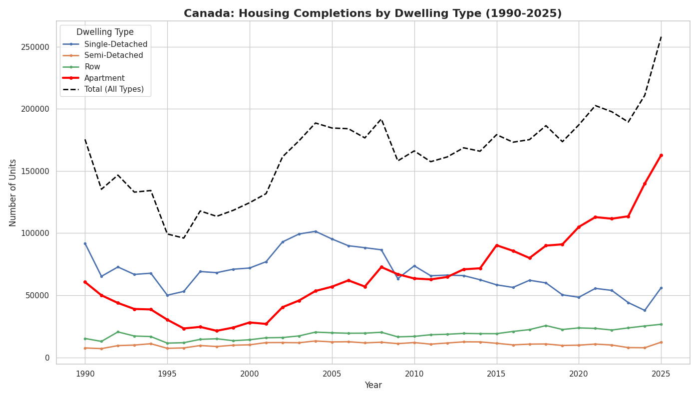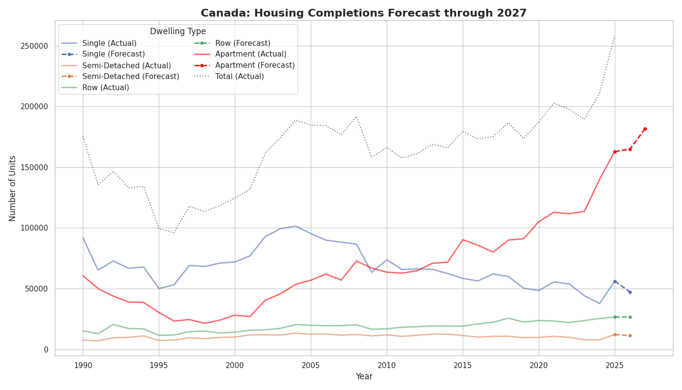 The upshot is that we anticipate two years of even higher levels of apartment completion. For 2026, single-detached completions should fall with semi-detached completions also falling slightly. Row Housing will likely remain flat.