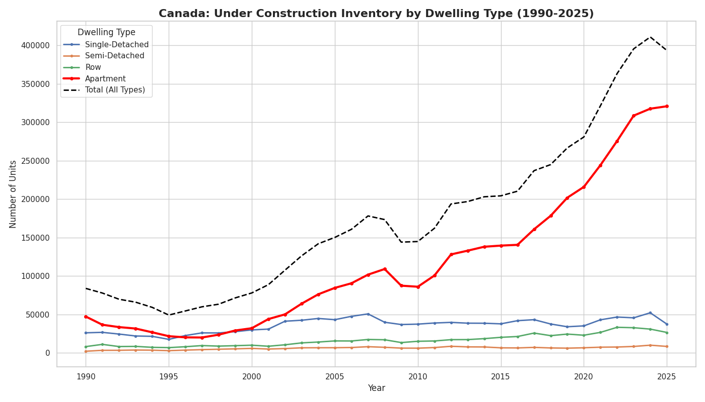 First, in Canada, when we talk about new housing, we are increasingly talking about apartments. The ~320,000 units under construction make up a whopping 81.5% of the total inventory under construction, so even small changes to absorption patterns in that market have disproportionately large effects.