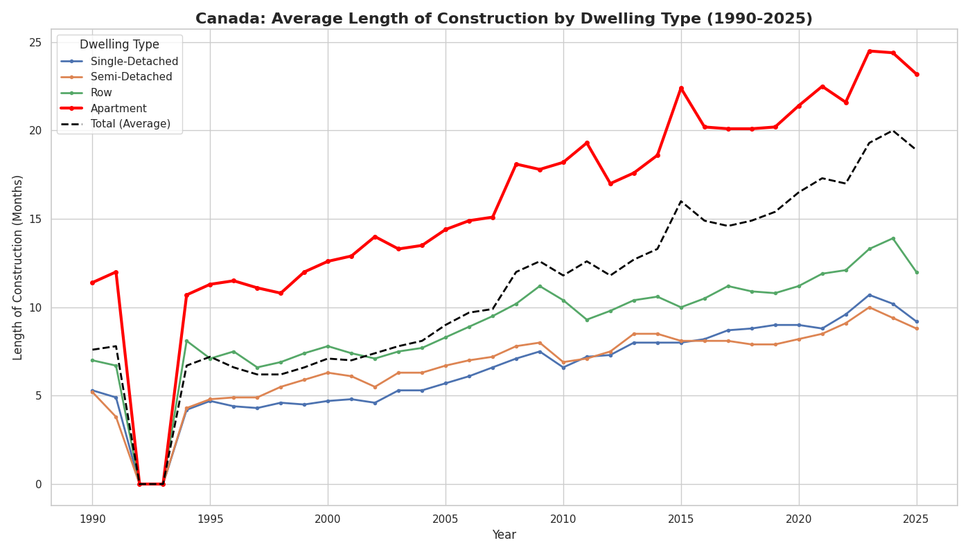 Ignoring the data blip of 1992-1993, construction times for every housing type have increased in a roughly linear fashion. There are many reasons for this that we will likely write about in the future, because we feel it is a material contributor to the overall housing affordability crisis, but for now, the most important data is the 2025 average construction time for each housing type: