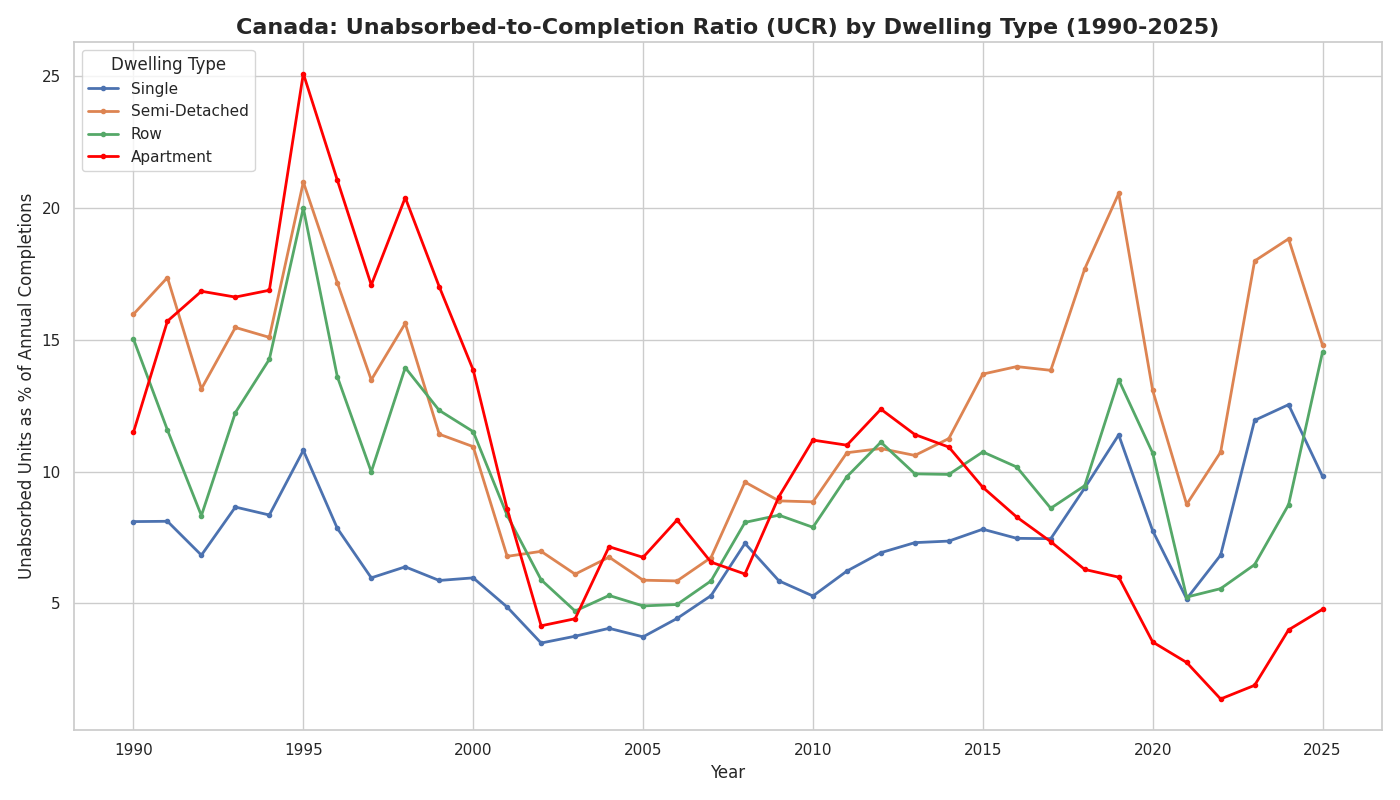 - This is a hard category because it’s so small it can swing more wildly from year to year. Demand is low for semi-detached, but like single-detached, the category will see fewer completions in 2026 than it did in 2025. Also like single-detached, the UCR for semi-detached peaked in 2024.